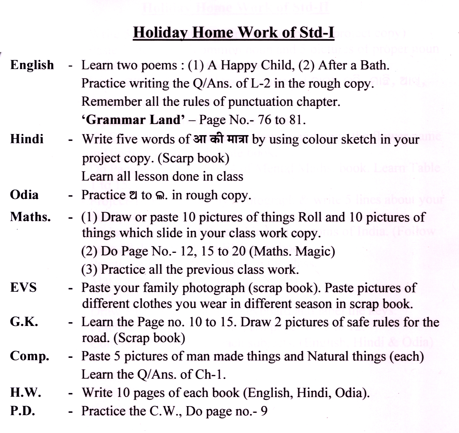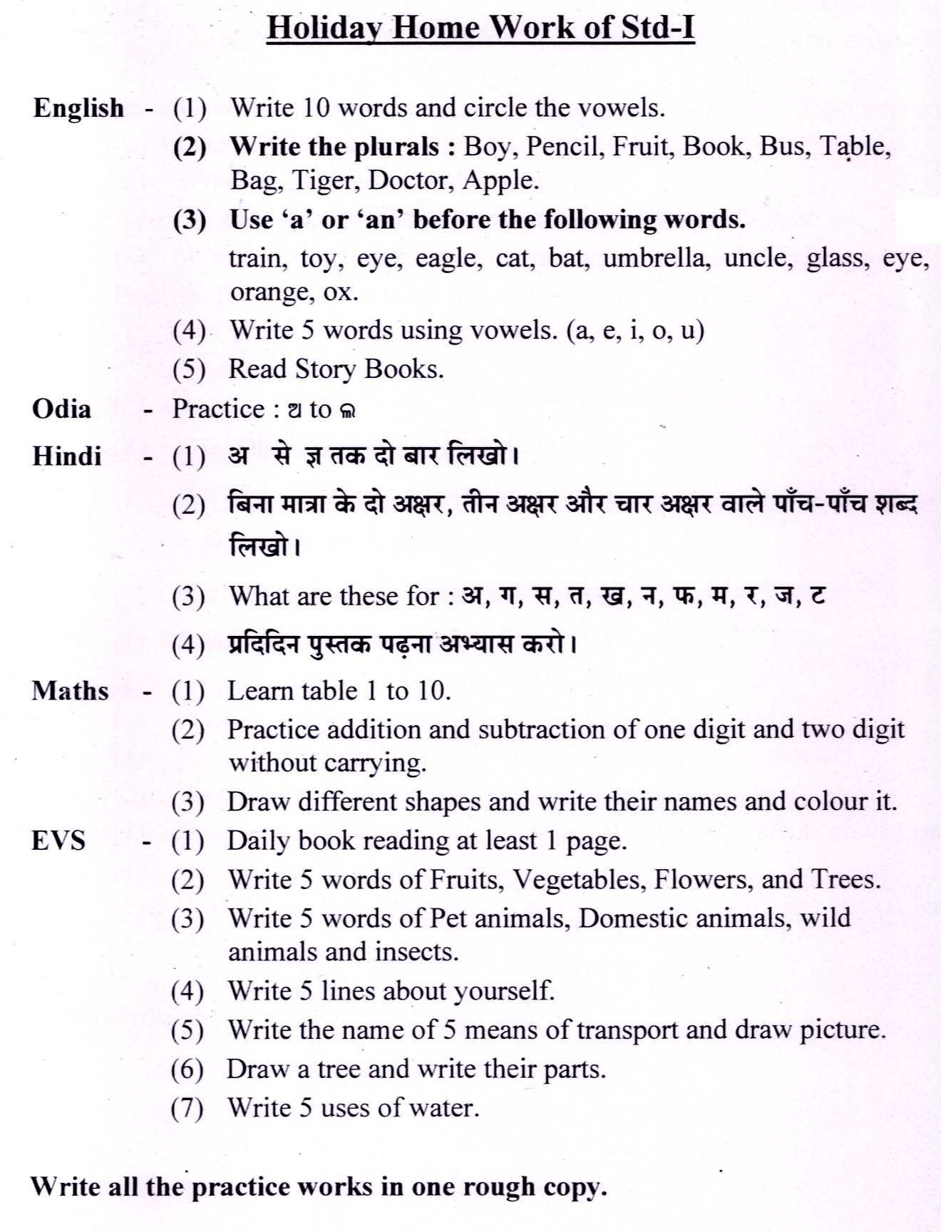 HOLIDAY HOMEWORK OF STD-1 (2019-20)