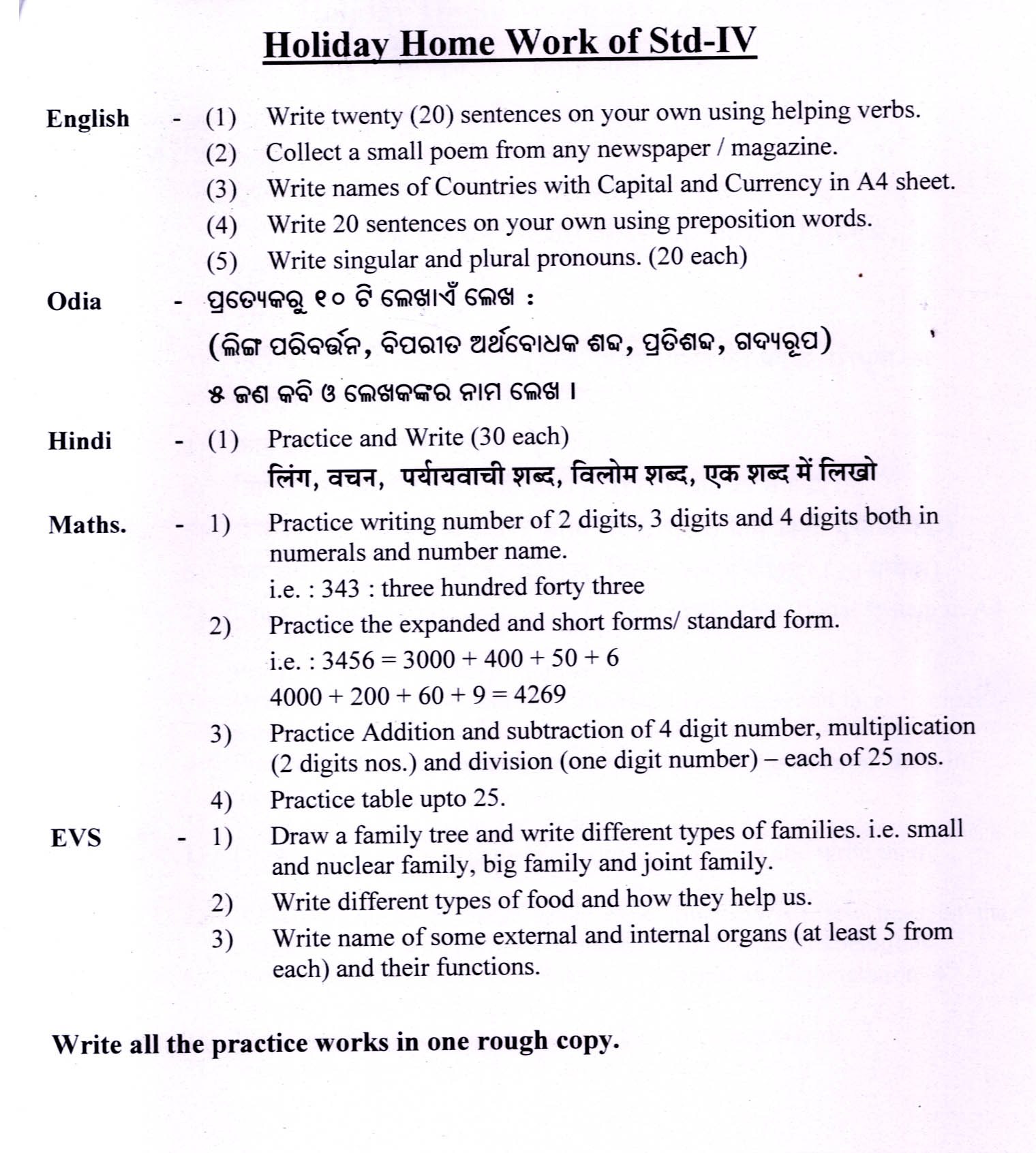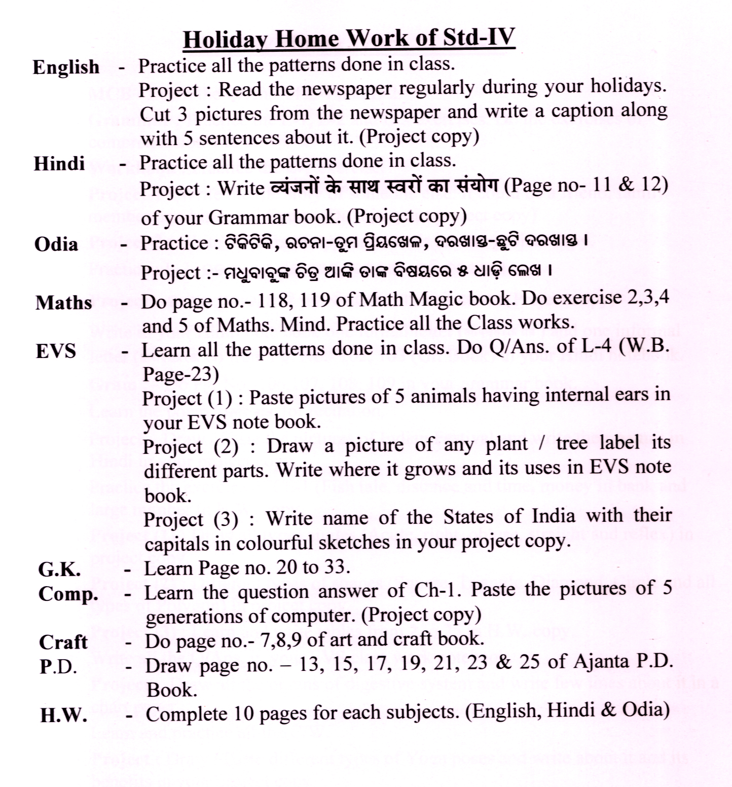 HOLIDAY HOMEWORK OF STD-4 (2019-20)