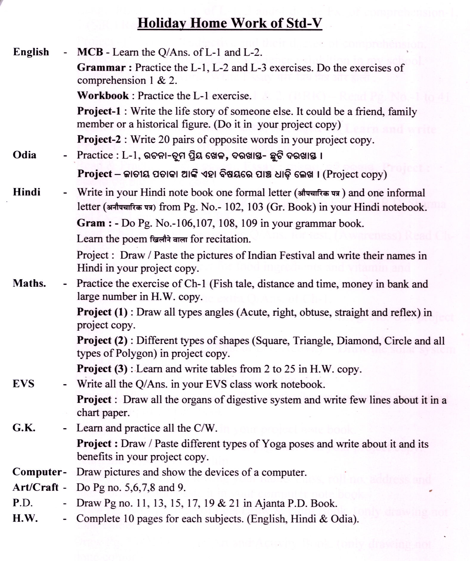 HOLIDAY HOMEWORK OF STD-5 (2019-20)