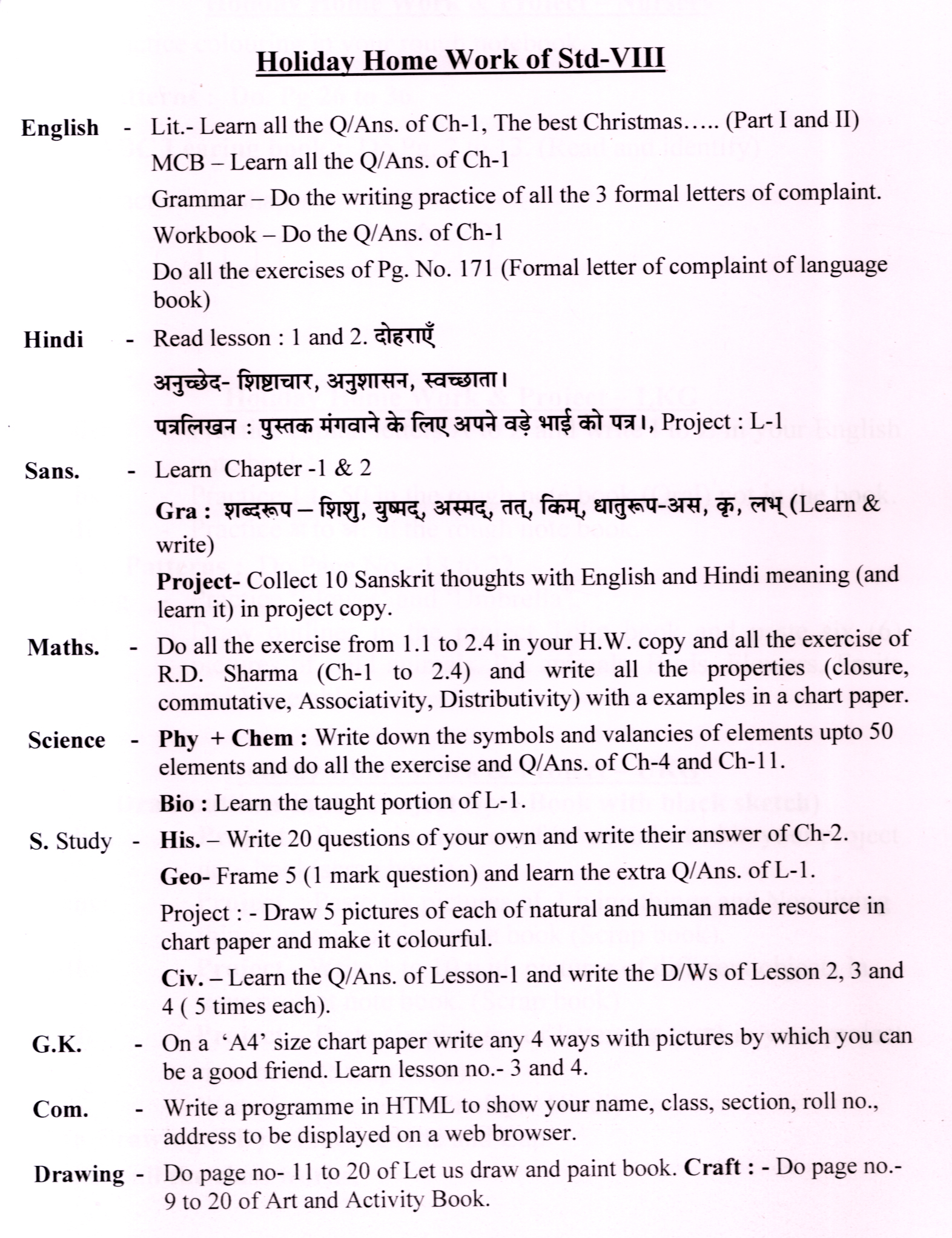 HOLIDAY HOMEWORK OF STD-8 (2019-20)