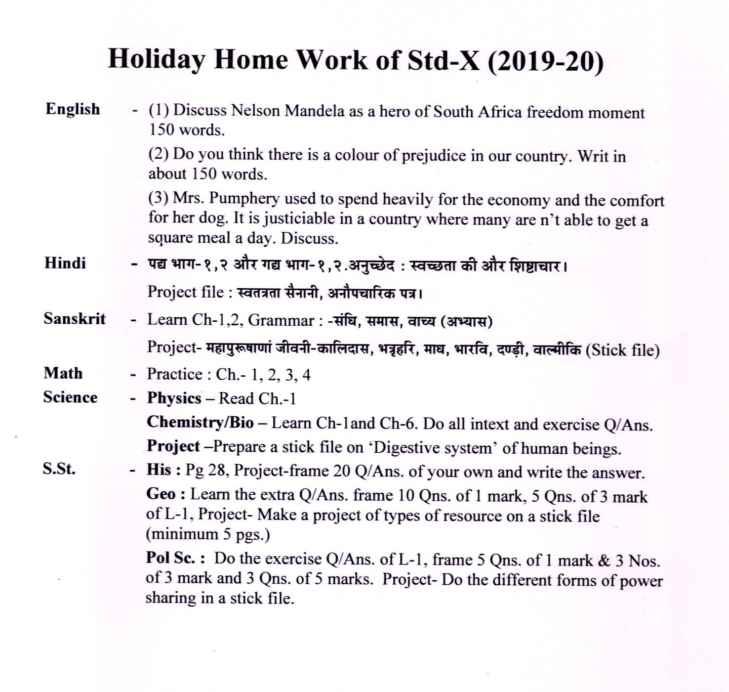 HOLIDAY HOMEWORK OF STD-10 (2019-20)